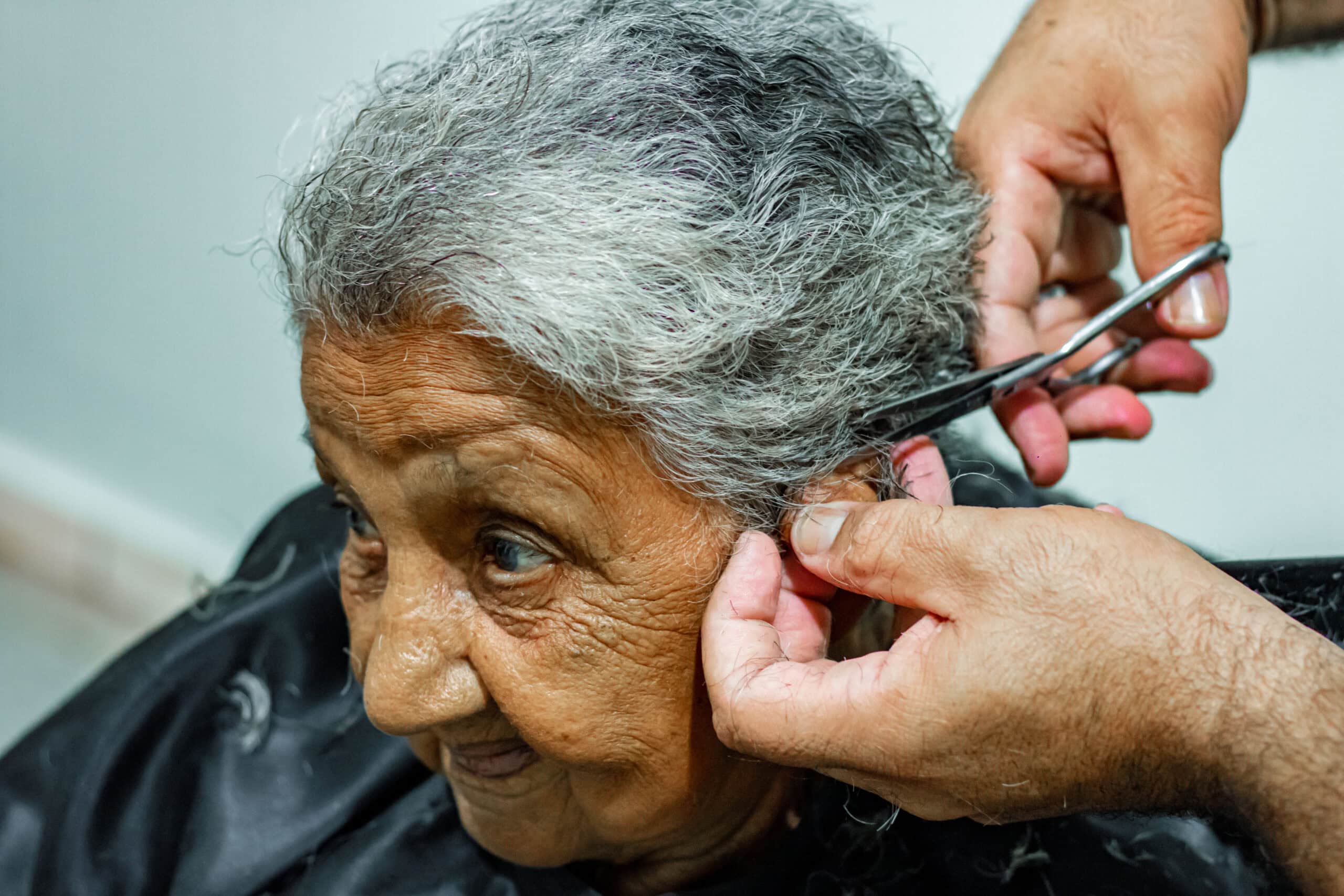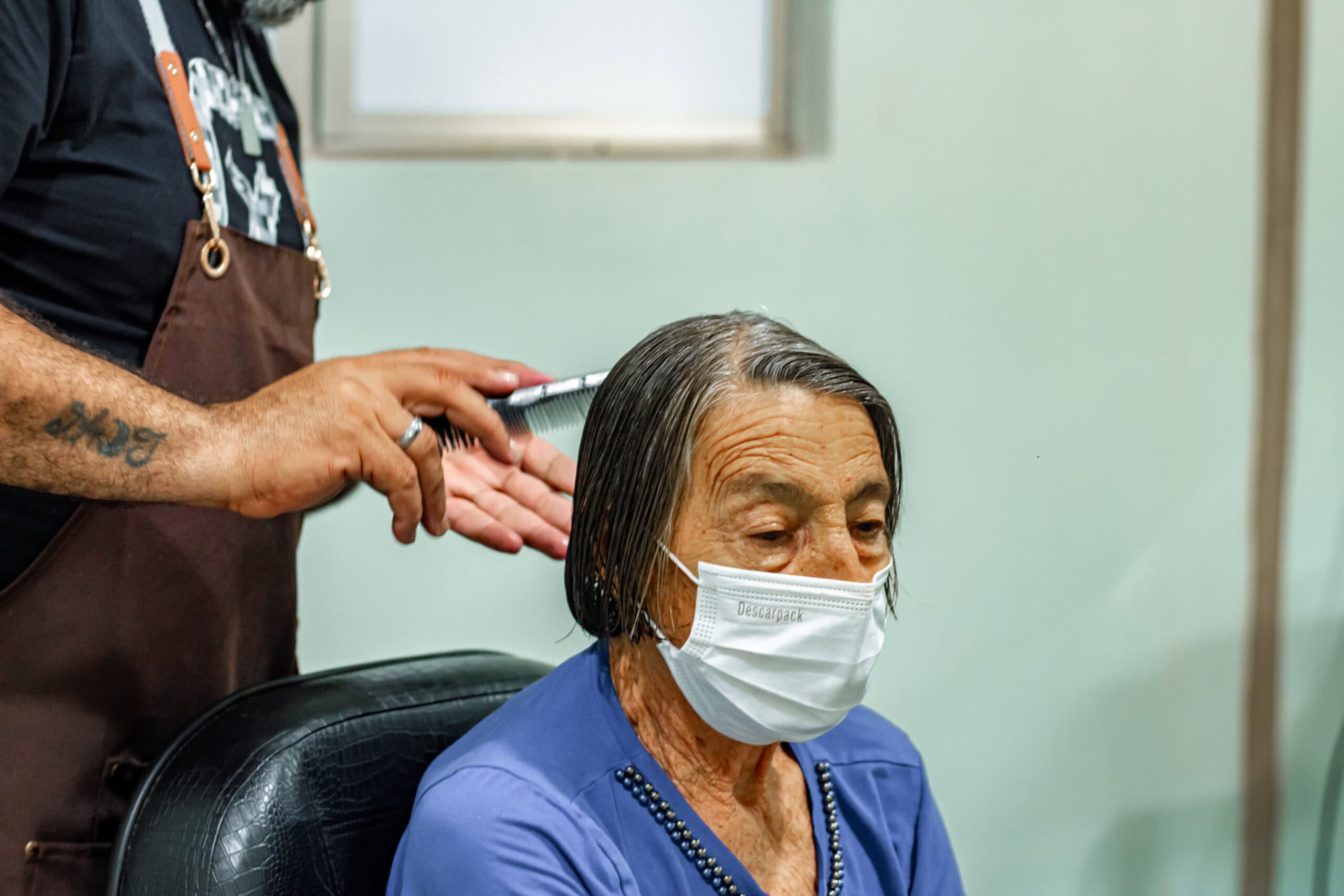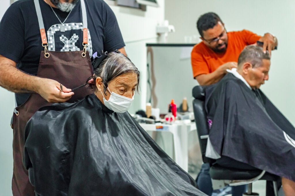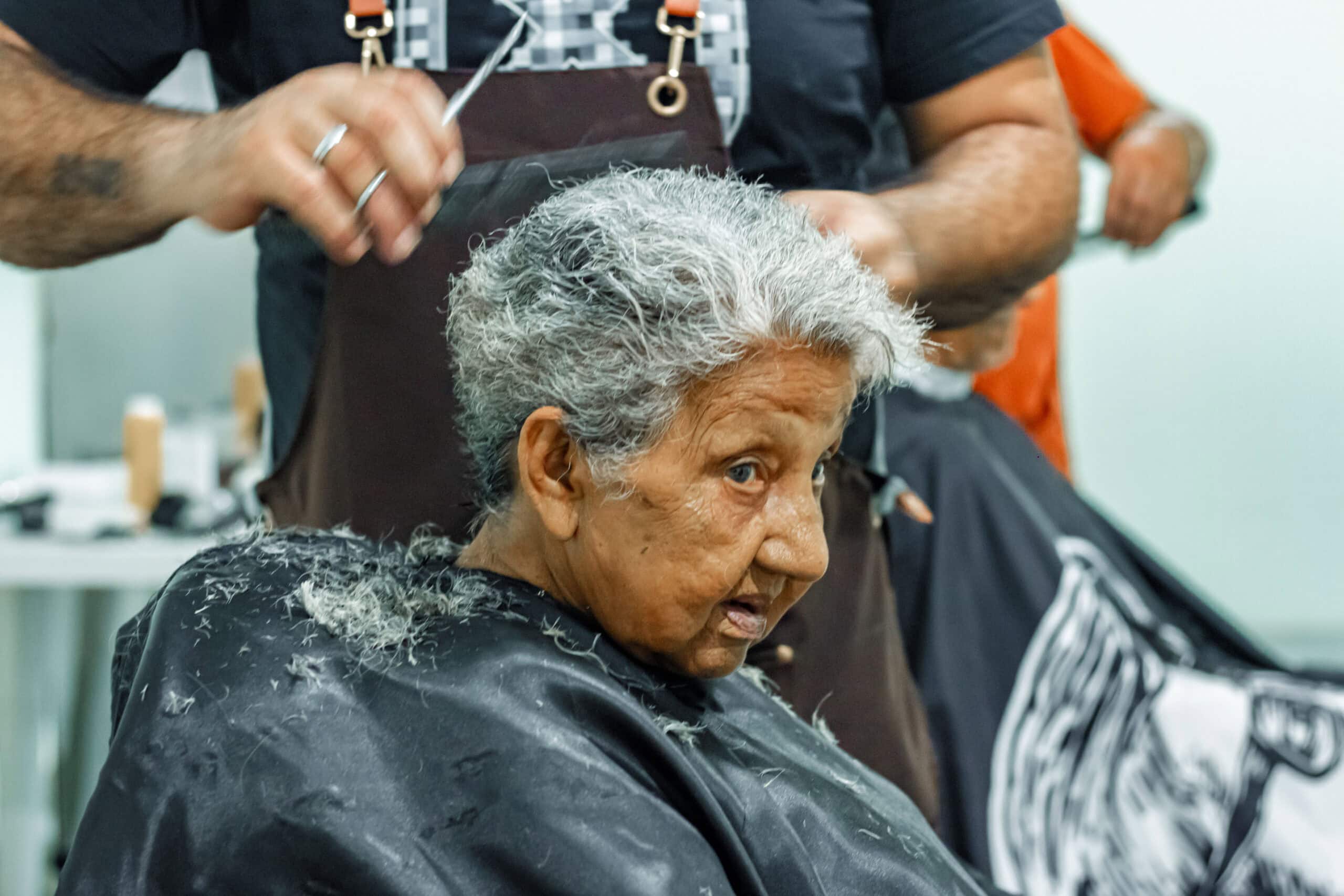 Francisca da Silva, de 83 anos, passou pela cadeira dos profissionais após anos sem cortar o cabelo, já grisalho. Ela não conteve as lágrimas quando se viu no espelho. “É o dia mais feliz da minha vida. Apesar da saúde frágil, hoje eu estou muito orgulhosa porque o pessoal daqui trata a gente tão bem. Eu chego doente com a doutora [Milagros] e saio boazinha”.