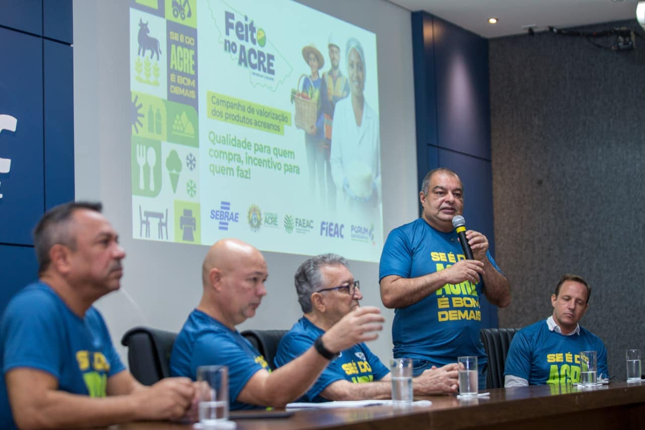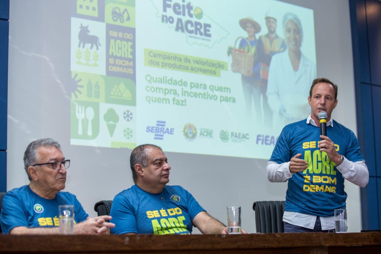 Com o objetivo de fortalecer a produção local e incentivar o consumo de produtos e serviços feitos no estado, o governo do Acre participou do lançamento da campanha Feito no Acre, realizado nesta sexta-feira, 12, no auditório da Federação das Indústrias do Estado do Acre (Fieac), em Rio Branco. A iniciativa é conduzida pelo Fórum Empresarial de Inovação e Desenvolvimento, pela Federação da Agricultura e Pecuária do Estado do Acre (Faeac) e pelo Serviço Brasileiro de Apoio às Micro e Pequenas Empresas (Sebrae/AC), em parceria com o governo.