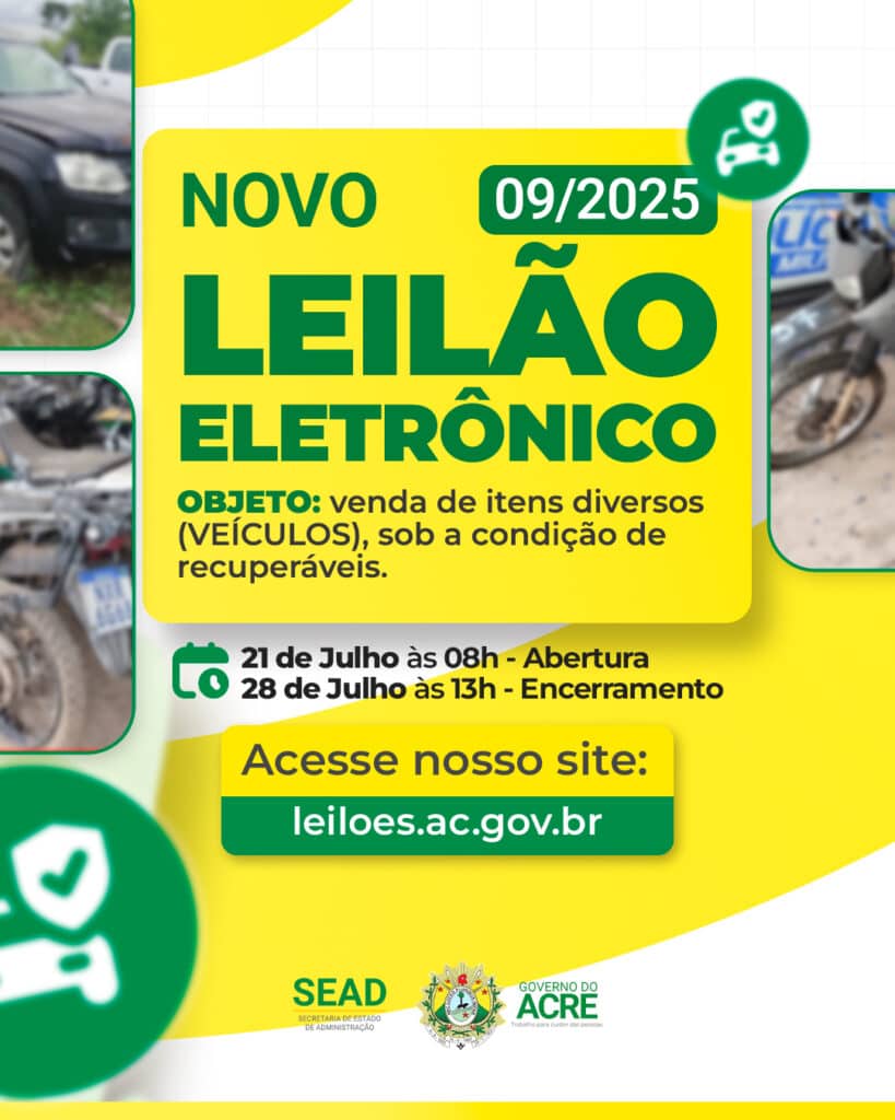 O governo do Estado do Acre, por meio da Secretaria de Estado de Administração (Sead), em parceria com a Polícia Militar do Acre (PMAC), realiza, a partir desta segunda-feira, 21 de julho, às 8h (horário local), o Leilão Eletrônico 09/2025 , com encerramento previsto para o dia 28 de julho, às 13h. O certame será realizado exclusivamente pela internet, por meio do Sistema Eletrônico de Leilões (SEL/AC), disponível em leiloes.ac.gov.br , e tem como objetivo a venda de veículos classificados como recuperáveis.